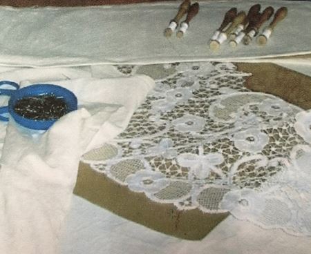 Deze typische kant soort wordt gemaakt op een kantkussen waarop het patroon wordt vastgespeld.