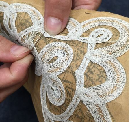Het motief wordt op een papier getekend waarop de kantwerkster met grote steken de machinaal vervaardigde linten naait.
