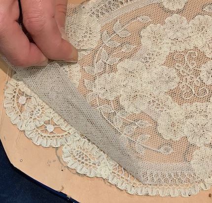 Men gebruikt een machinaal vervaardigde tule als basis waarop dan bloempjes, blaadjes en takjes met de hand worden opgenaaid.